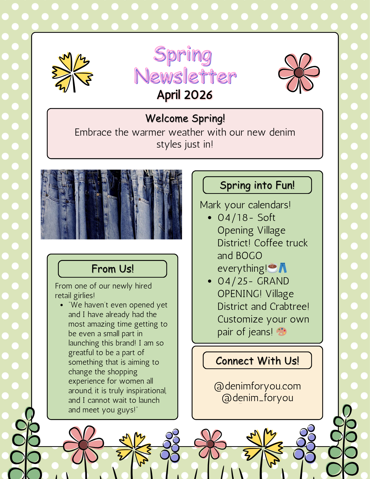 Overall, the creation of Denim for You and related PR materials significantly strengthened my skills as an aspirational PR professional. Working across multiple touch points pushed me to think strategically about consistency, audience engagement, and storytelling across different formats. It allowed me to develop one core brand identity and apply it to multiple different platforms. Overall, it built my ability to design integrated communication strategies that connect emotionally with audiences while reinforcing a cohesive brand narrative across every platform.